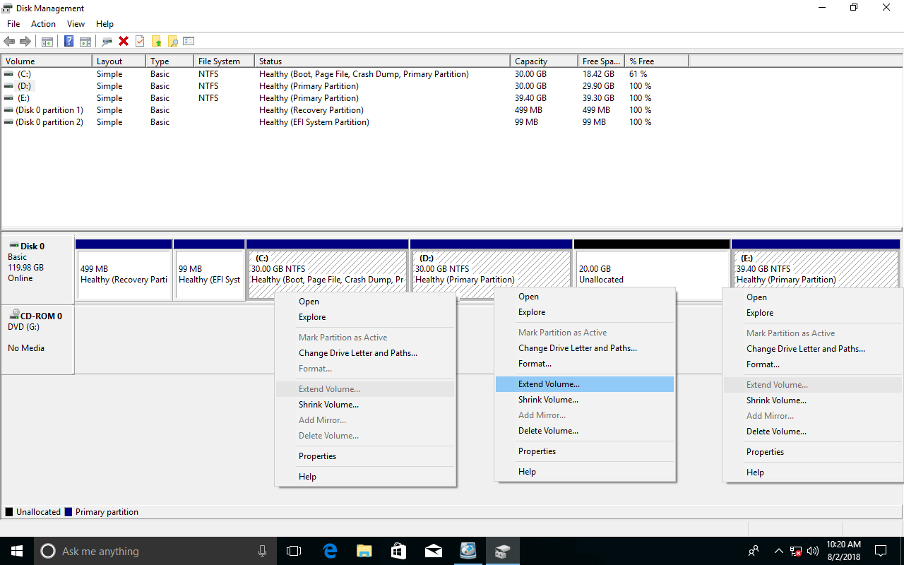 To show you this limitation, I shrank drive D on my Windows 10 laptop. As you see, Extend Volume doesn't work for both drive C and E after shrinking D. (20GB Unallocated space is nonadjacent to drive C and is on the left side of E.)