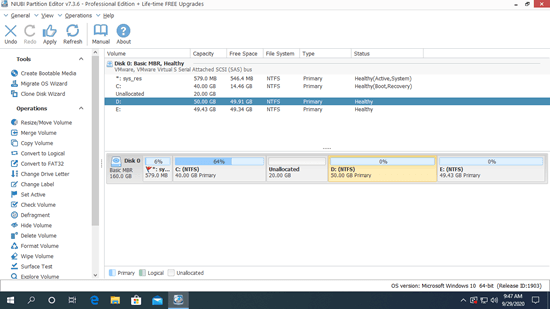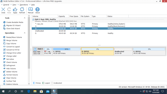 Besides shrinking and extending partition, moving and merging Unallocated space, NIUBI Partition Editor helps do many other operations. Better than other tools, it has advanced Virtual Mode, 1-Second Rollback and Cancel-at-will technologies to protect system and data.