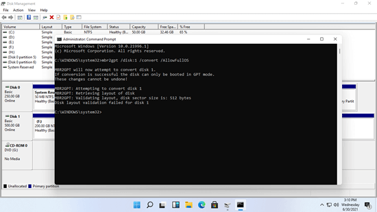 Windows 11コンピュータでMBR2GPTコマンドを実行することに違いはありませんが、ディスクパーティション構成が以下の要件を満たす必要があります。